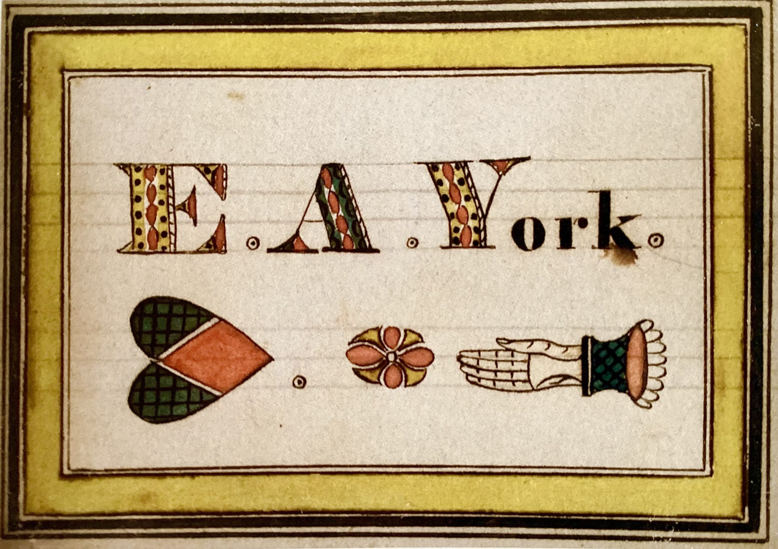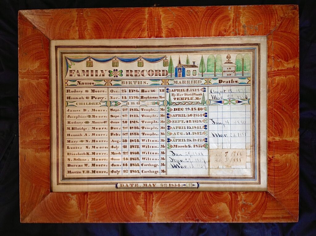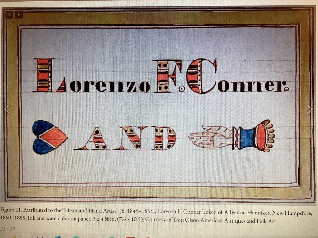 I first became aware of the Heart and Hand Artist when I discovered years ago an 1854 family record of the Moore family from Carthage, Maine (Figure 1). I was immediately taken with the exceptional calligraphy and colorful graphics memorializing Hannah Perry and Rodney Moore’s marriage, the birth dates of their eleven children, and times of death. The name “Heart and Hand Artist” derives from the artist’s often use of a heart tuned sideways and an open right hand pointing left separated by the word “and” forming a cryptogram (Figure 2). This symbolism reflected the bonds of familial love, as well as humanity and brotherly love.