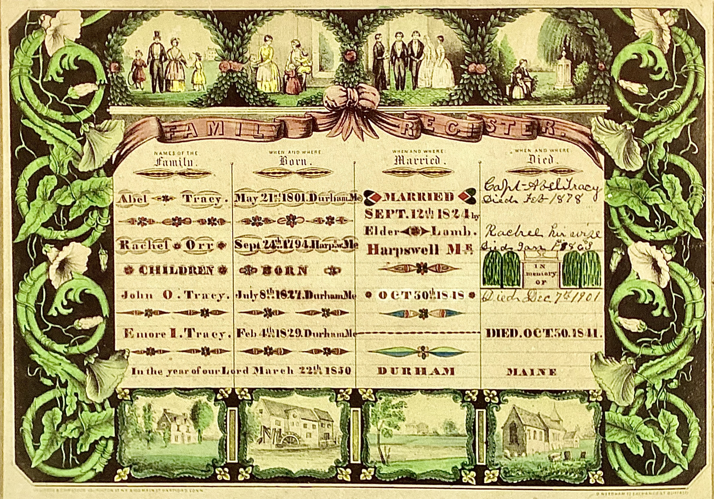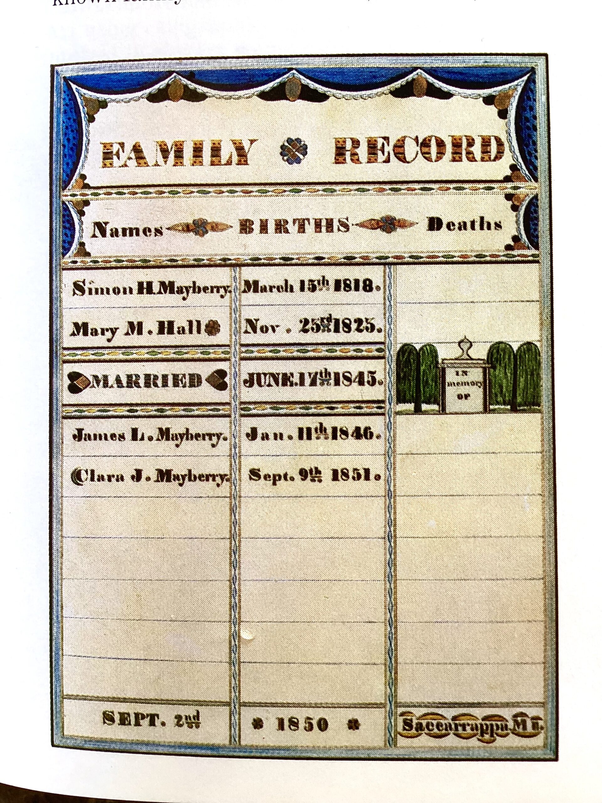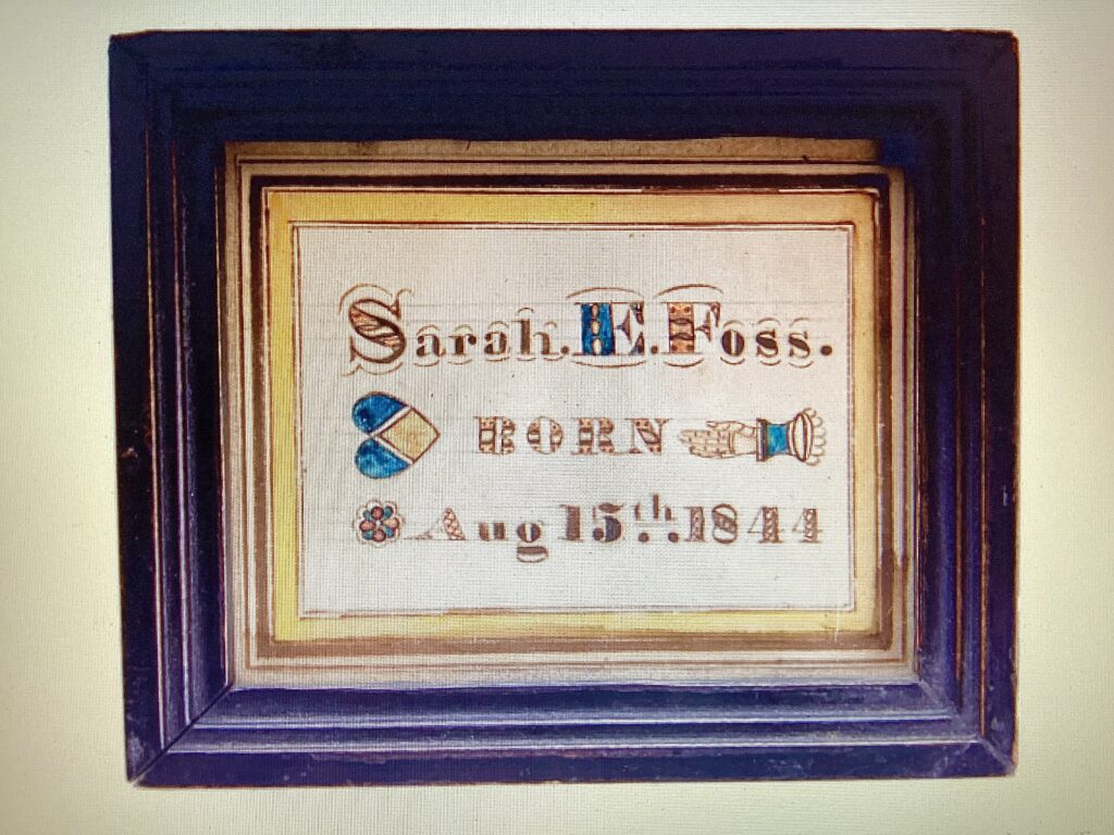 The earliest known work by this artist was created in Gilmanton, NH in 1849, although it is likely that the artist was active before this. The format used was variable with some being small, individual birth records (Figure 3) or a token of affection (Figure 4); a vertical three column format with “Names”, “Births” and “Deaths” with a bold “Family Record” title and swag and tassel curtains and memorial and willow trees in the middle of the “Deaths” column (Figure 5); or a horizontal four column format adding a “Married” column with the memorial and willow trees moved to the top of the sheet and an added church with fenced yard surrounded by pointed evergreen trees (Figure 1).